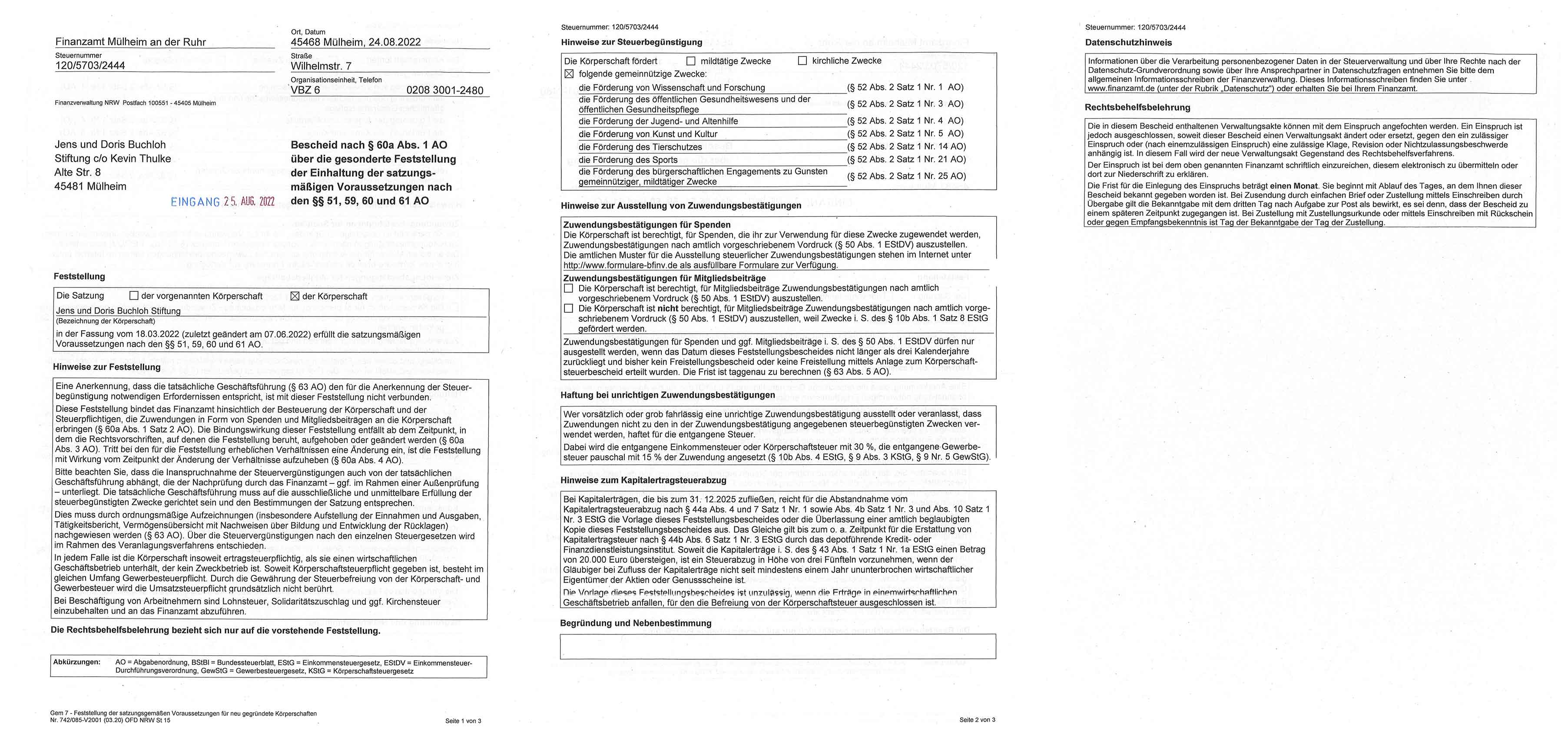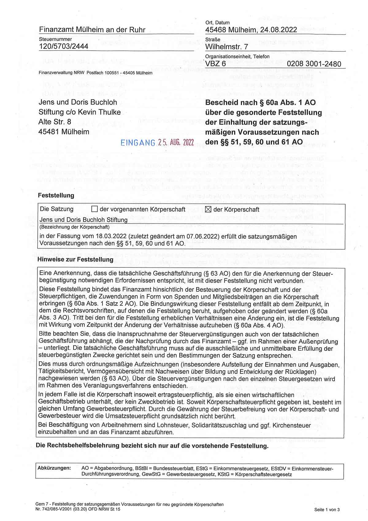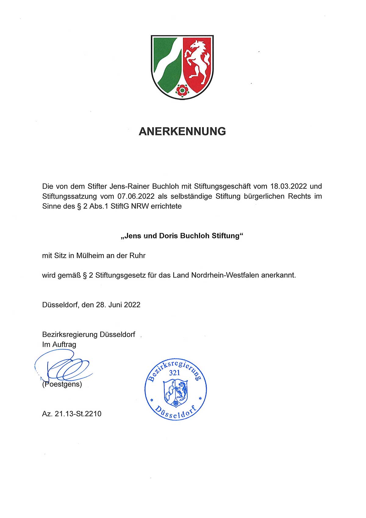 Die Gründung der Stiftung beruht auf der visionären Idee des Stifters und seiner Ehefrau, nach jahrzehntelanger, erfolgreicher unternehmerischer Tätigkeit auch über Lebzeiten hinaus in verschiedenen gesellschaftlichen Bereichen Verantwortung zu übernehmen und dauerhaft soziales Engagement zu leisten und zu fördern. Die Stiftungszwecke erstrecken sich über eine Vielzahl gesellschaftlich relevanter Aufgaben, wobei die Stiftung sich dabei als Instrument zur langfristigen Förderung positiver Veränderungen und nachhaltiger Unterstützung der Gemeinschaft sieht. Die Jens und Doris Buchloh Stiftung verpflichtet sich, die Werte und Ideale der Stifter in die Praxis umzusetzen. Mit einem klaren Fokus auf gesellschaftliche Verantwortung strebt die Stiftung danach, einen nachhaltigen Beitrag zu leisten und eine inspirierende Kraft für positive Veränderungen zu sein. Ihr Wirken basiert auf einer umfassenden Vision, die darauf abzielt, die Lebensqualität von Menschen in verschiedenen Lebensbereichen nachhaltig zu verbessern.